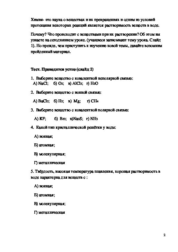 1. Актуализация знаний. Тест по теме «Химические связи.