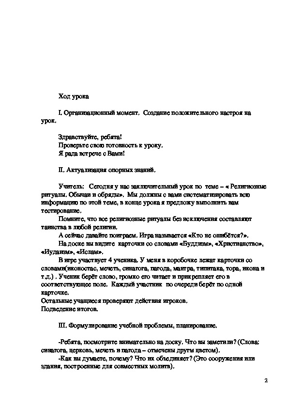 Цель урока: познакомить учащихся с религиозными обычаями и обрядами в христианстве, исламе, иудаизме и буддизме, которые проходят в церкви, синагоге, мечети, пагоде.