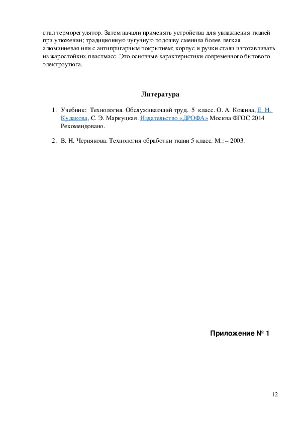 2. В. Н. Чернякова. Технология обработки ткани 5 класс. М.: – 2003.