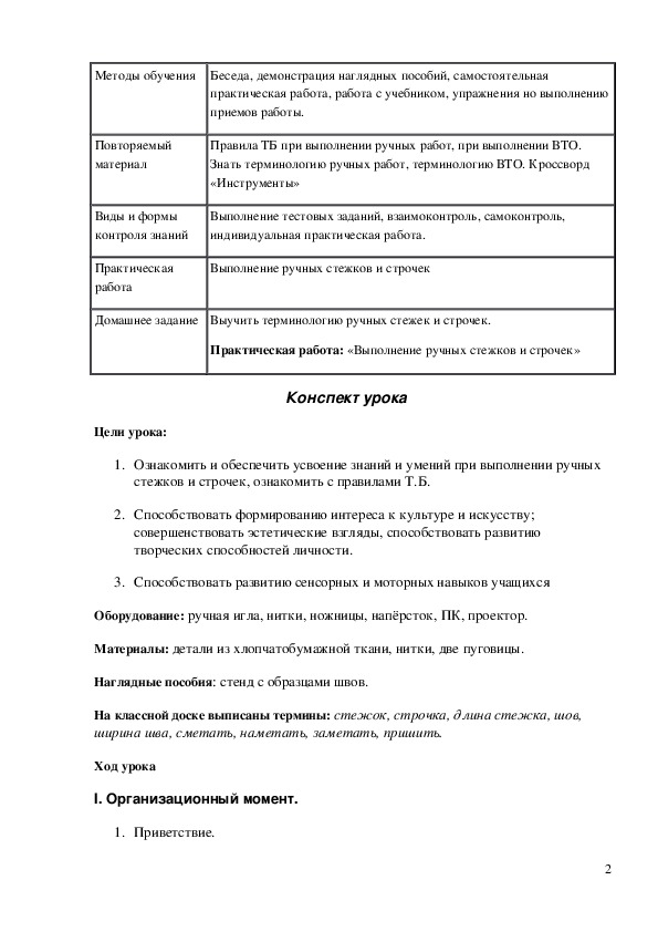 При изучении темы «Виды ручных стежков и строчек» учащиеся знакомятся с классификацией швов, с их условными и графическими изображениями, осваивают последовательные этапы выполнения шва. Наиболее эффективное усвоение материала учащимися достигается не репродуктивным методом обучения, когда идет запоминание и воспроизведение сообщаемой информации, а проблемно-поисковым методом обучения. Организация работы учащихся на уроке может быть и индивидуальной, и групповой (они сами могут выбирать). Степень сложности постановки задачи при изучении каждого нового шва должна повышаться. Способы проверки знаний учащихся могут быть в виде тестов, контрольных вопросов, а также в виде вопросов, которые составили сами учащиеся после изученного материала. Такой способ проверки знаний удачно подходит при групповой работе учащихся. Группа заполняет технологическую карту, выполняет швы, составляет вопросы и задает их другим группам, а для учителя это способ выявить, насколько правильно и глубоко учащиеся усвоили пройденную тему урока.Конспект урока "Ручные швы" 5 класс