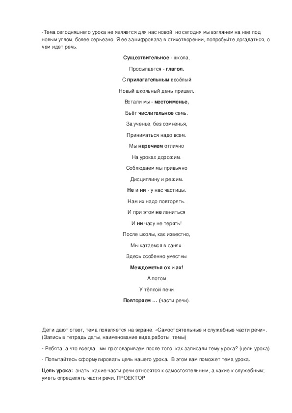 Цель урока (для учащихся): распознание частей речи, отличие самостоятельные от