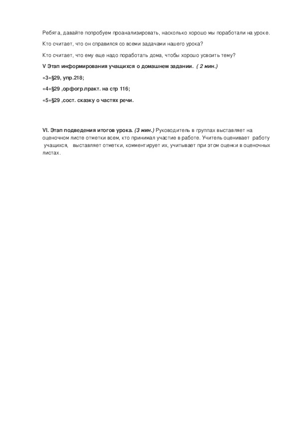 оценочном листе отметки всем, кто принимал участие в работе. Учитель оценивает работу