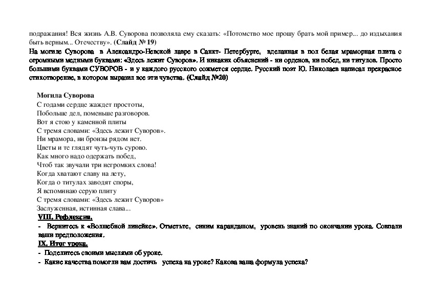 Его жизнь хороший пример для будущих поколений: великая цель, великие дела, слава Отчизны. Вот идеал, достойныйподражания! Вся жизнь А.В. Суворова позволяла ему сказать: «Потомство мое прошу брать мой пример... до издыхания