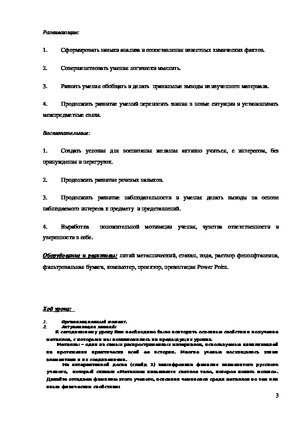 3. Продолжить формировать умения давать характеристику элемента по его положению в периодической системе химических элементов Д.И. Менделеева, на основе строения атома объяснять физические и химические свойства металлов, прогнозировать их применение.