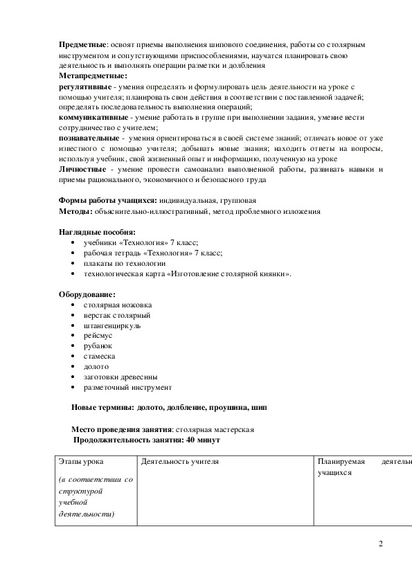 1Предметные: освоят приемы выполнения шипового соединения, работы со столярным