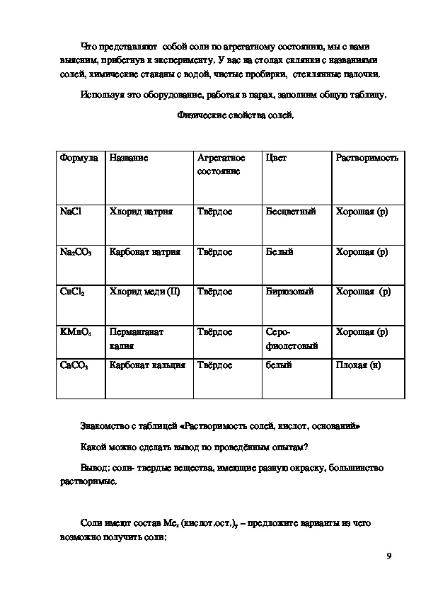 солей, химические стаканы с водой, чистые пробирки, стеклянные палочки.