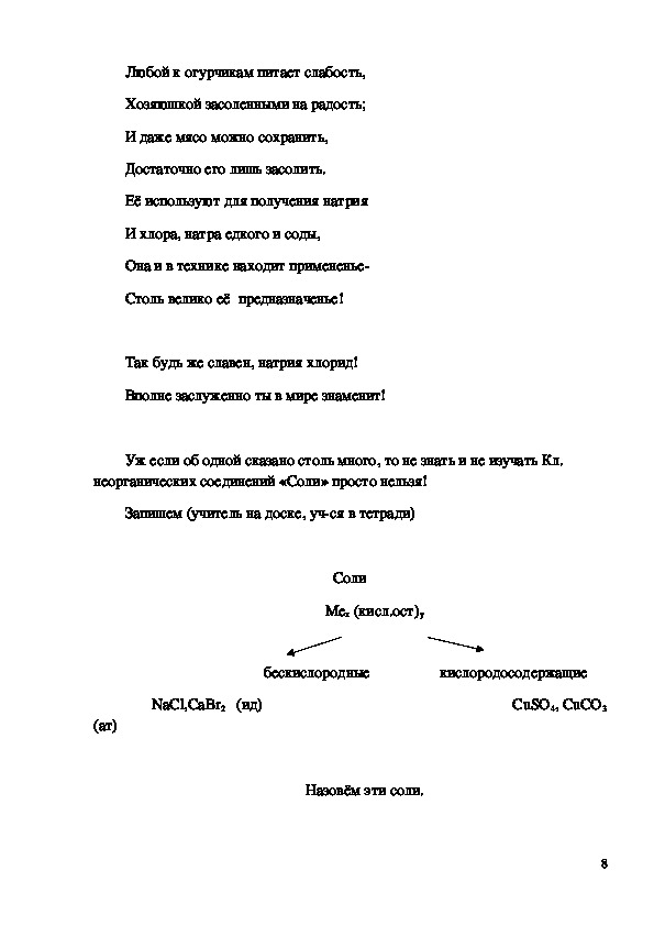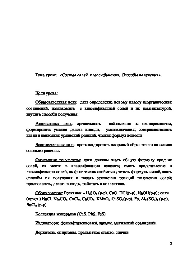 Образовательная цель: дать определение новому классу неорганических соединений, познакомить с классификацией солей и их номенклатурой, изучить способы получения.