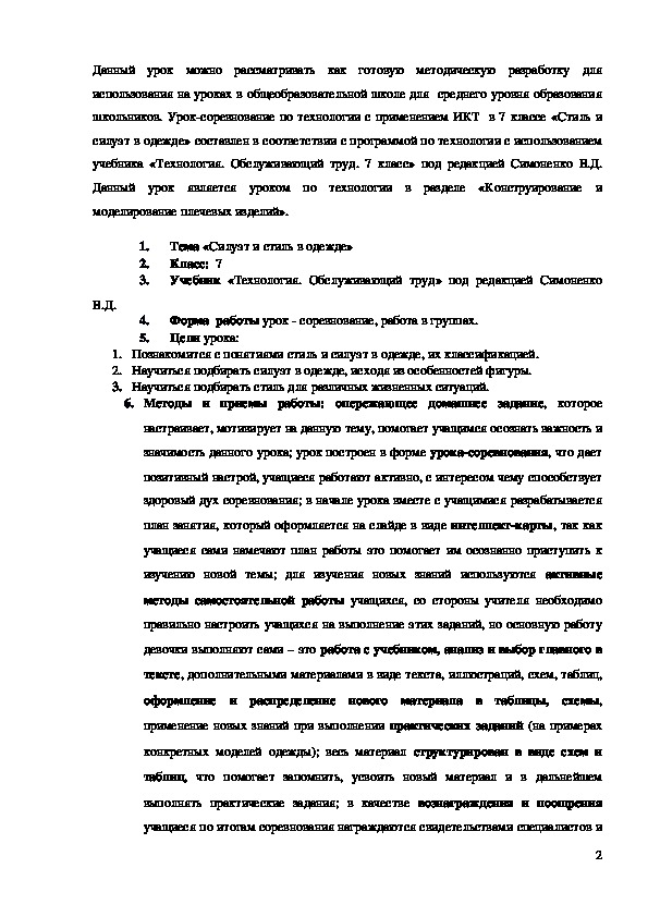 Данный урок можно рассматривать как готовую методическую разработку для использования на уроках в общеобразовательной школе для среднего уровня образования школьников. Урок-соревнование по технологии с применением ИКТ в 7 классе «Стиль и силуэт в одежде» составлен в соответствии с программой по технологии с использованием учебника «Технология. Обслуживающий труд. 7 класс» под редакцией Симоненко В.Д. Данный урок является уроком по технологии в разделе «Конструирование и моделирование плечевых изделий».