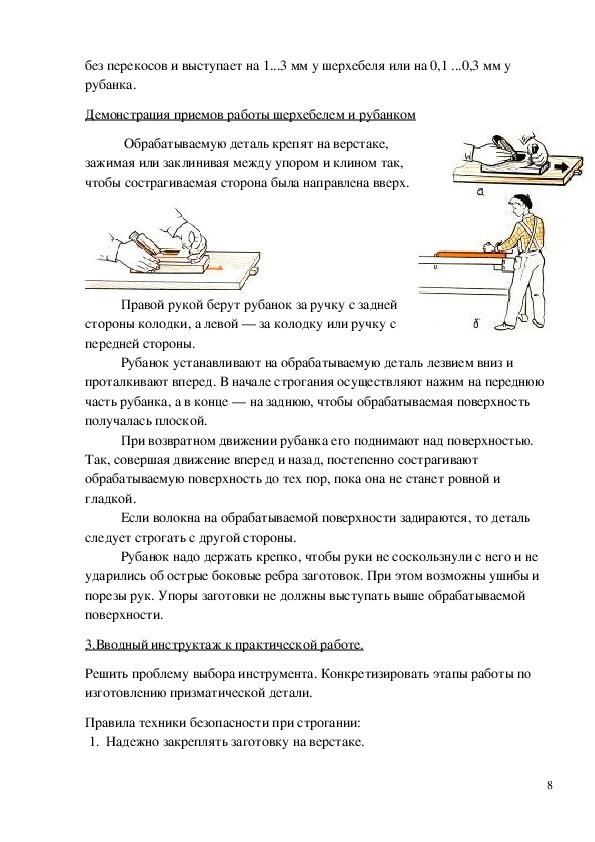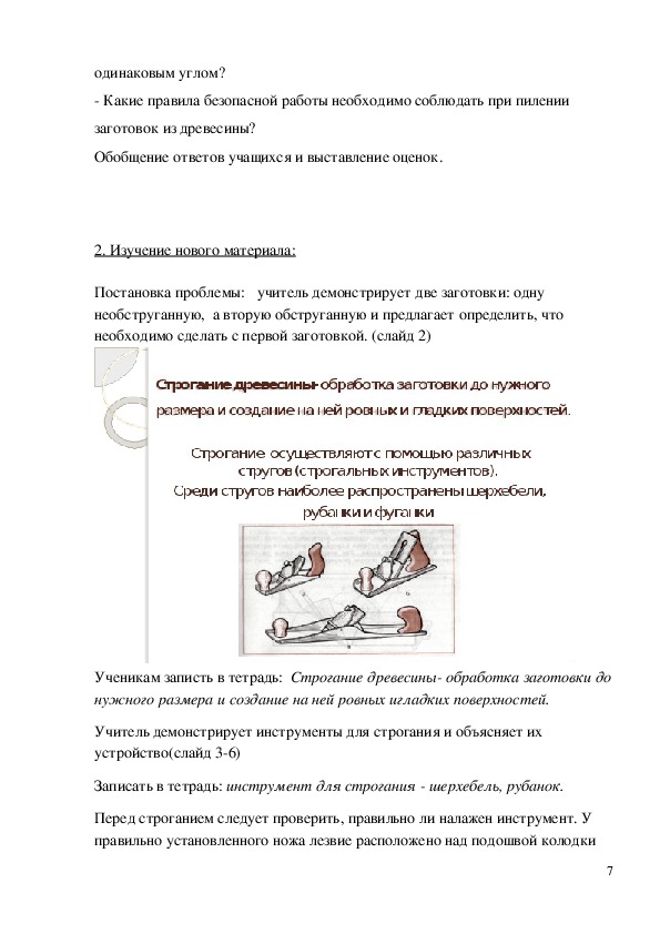 Предметные учащиеся ознакомятся с устройством и приемами работы шерхебелем и рубанком. приемами контроляпрямого угла, прямолинейности отстроганной поверхности.