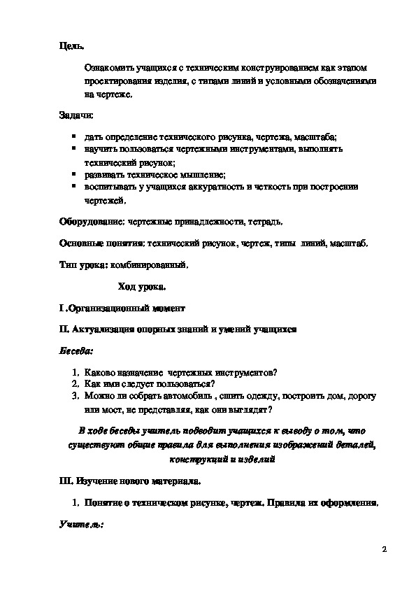 Ознакомить учащихся с техническим конструированием как этапом проектирования изделия, с типами линий и условными обозначениями на чертеже.