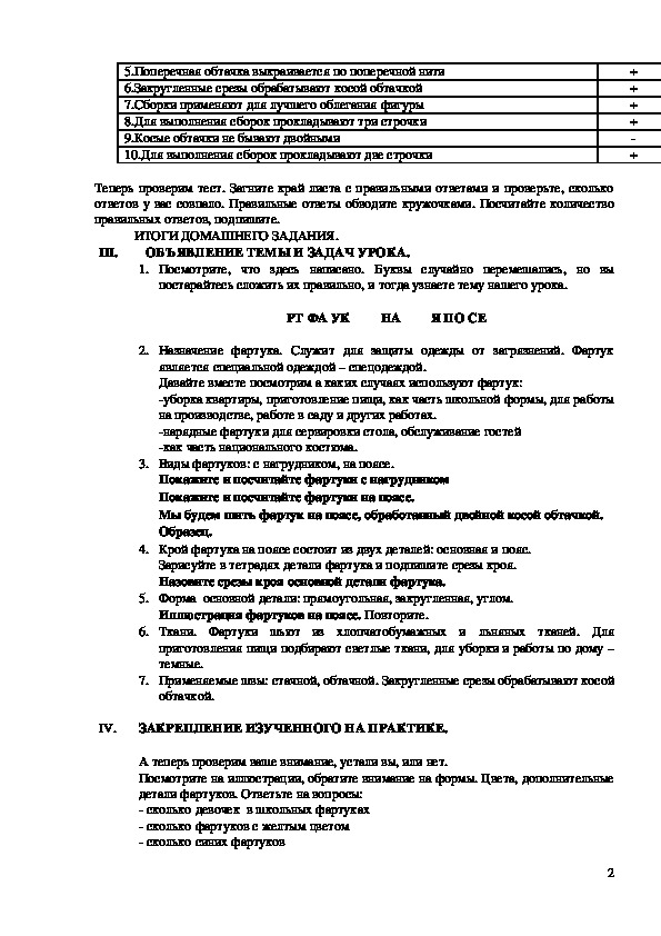Цель: Дать учащимся сведения по технологии пошива фартука, способствовать развитию навыков