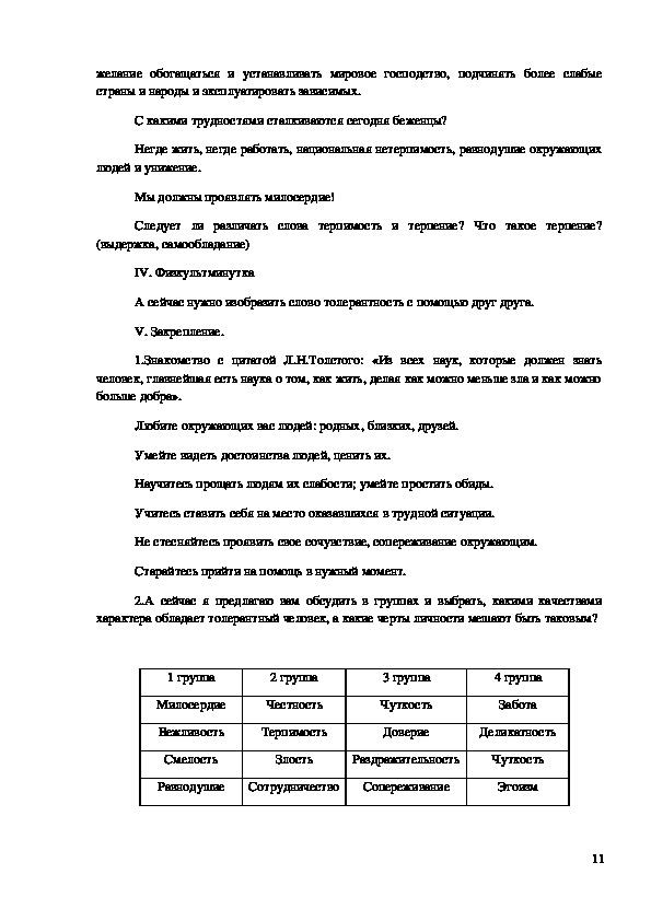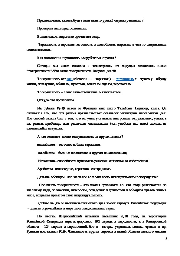 Цель урока: ознакомление обучающихся с толерантностью, на примере