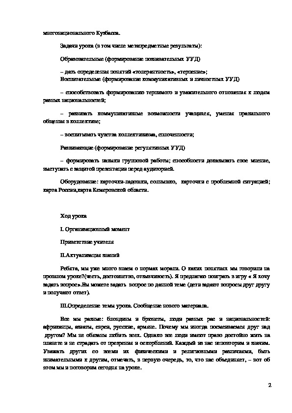 Цель урока: ознакомление обучающихся с толерантностью, на примере многонационального Кузбасса.