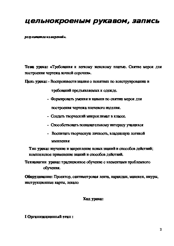 Тема урока: «Требования к легкому женскому платью. Снятие мерок для построения чертежа ночной сорочки».