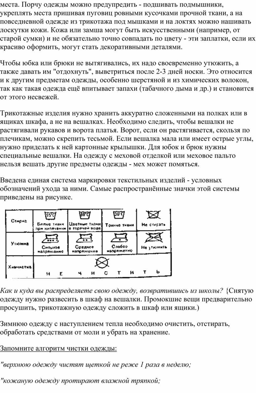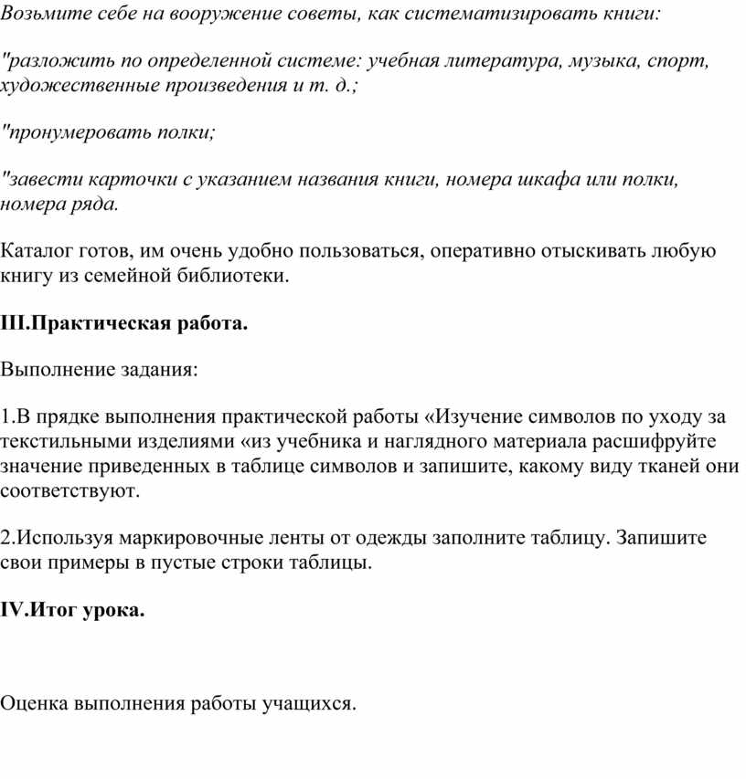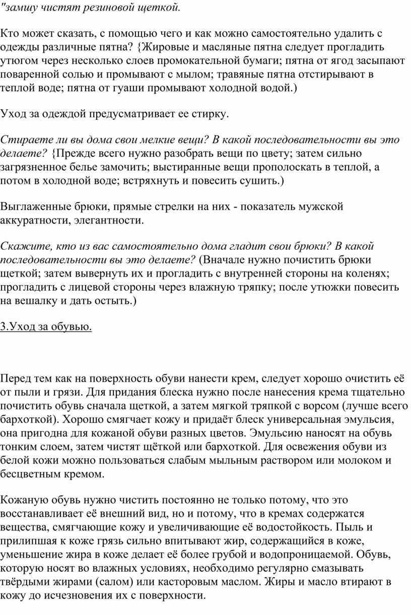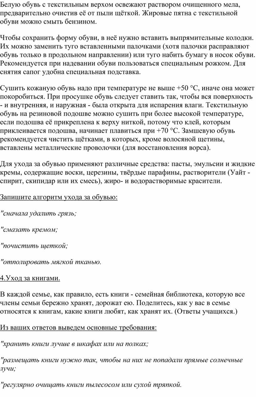 Цель: ознакомить учащихся с основными приемами ухода за помещениями и одеждой, книгами, обувью и др.