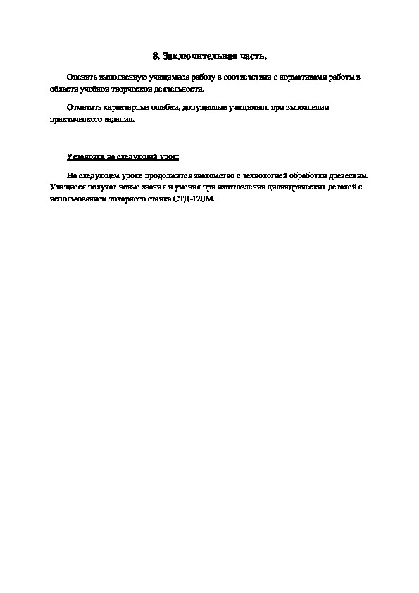 8. Заключительная часть. Оценка качества работы – 5 мин.Ход урока.