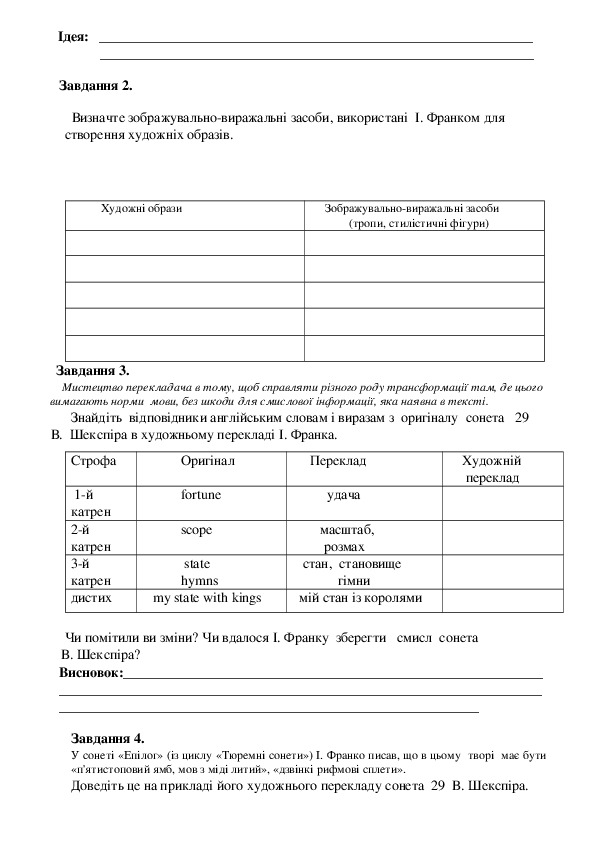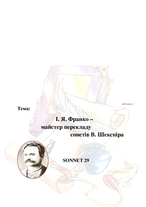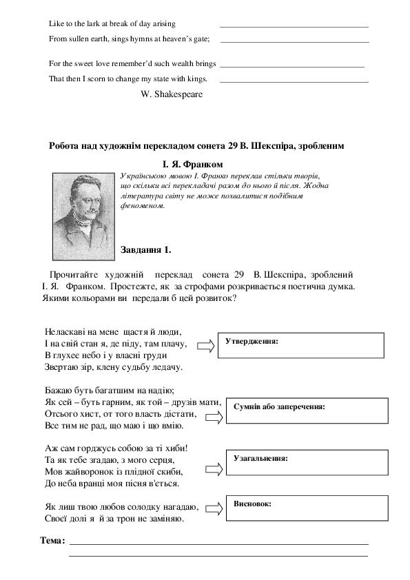 Тема: І. Франко – майстер перекладу сонетів В. Шекспіра