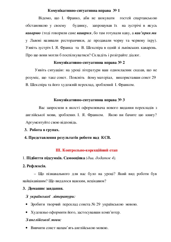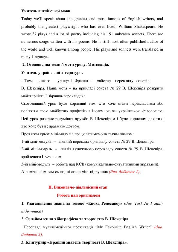 На этом уроке учащиеся познакомятся с деятельностью И.Франка как переводчика сонетов с английского языка, смогут проанализировать оригинал и перевод сонета №29 Шекспира. Использование коммуникативно-ситуативных упражнений поможет учащимся проявить свое творчество, повторить художественные средства выразительности, найти соответствие между словами, составить диалог.Конспект урока по украинской литературе в 10 классе "І. Франко – майстер перекладу сонетів В. Шекспіра"