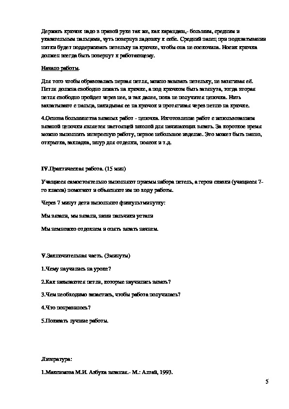 Цель: Овладение начальными практическими приемами вязания крючком.