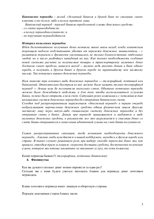 Цель: создать условия для формирования знаний об основных видах денежных переводов