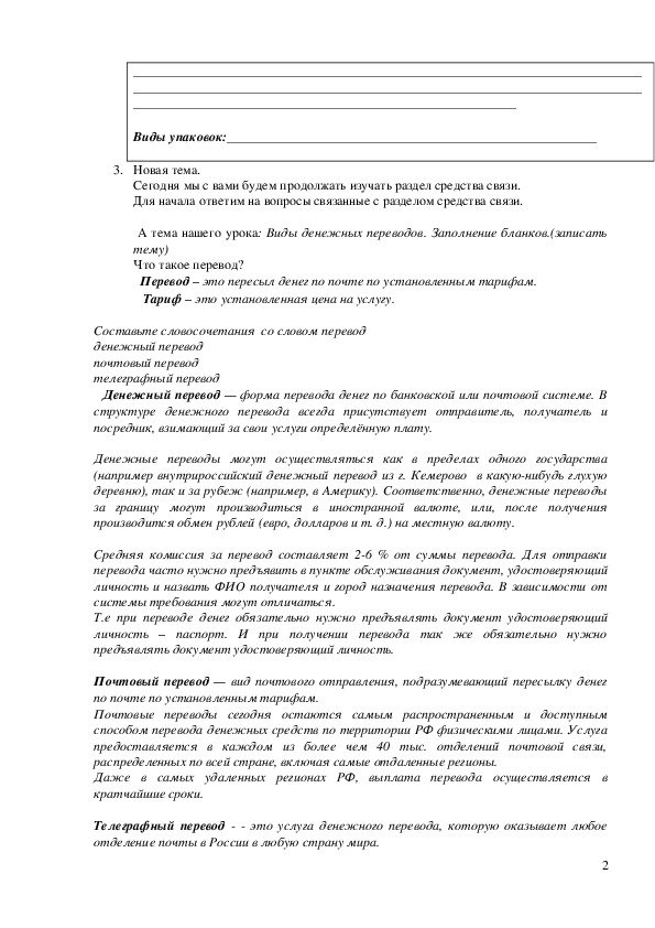 Тема: Виды денежных переводов (почтовые, телеграфные). Практическая работа по