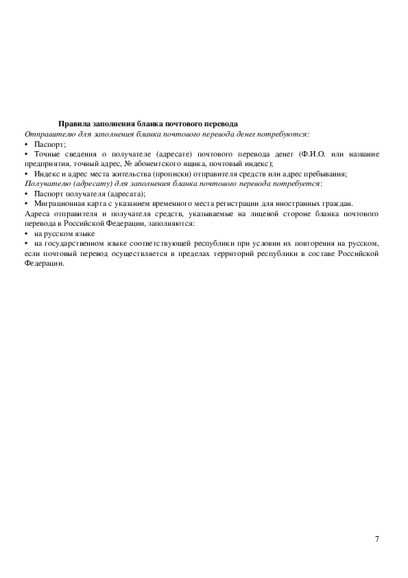 Получателю (адресату) для заполнения бланка почтового перевода потребуется: