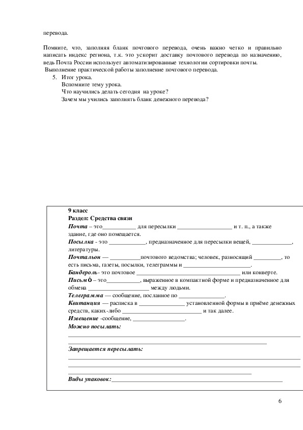 Тема: Виды денежных переводов (почтовые, телеграфные). Практическая работа по заполнению бланка почтового денежного перевода.