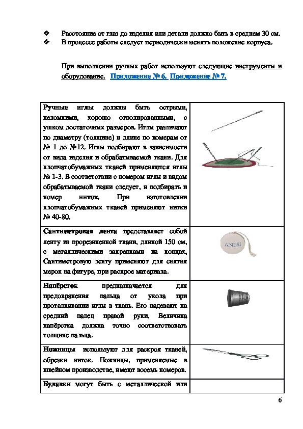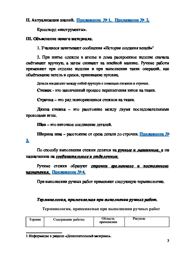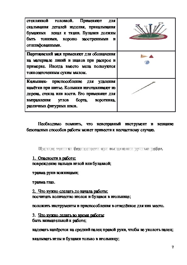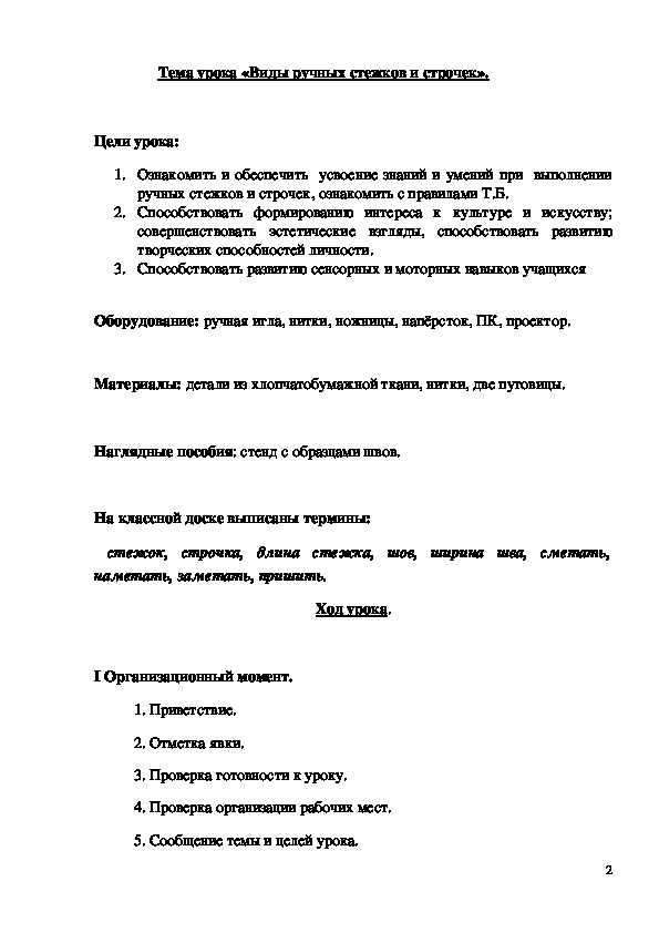 ручных стежков и строчек, ознакомить с правилами Т.Б.