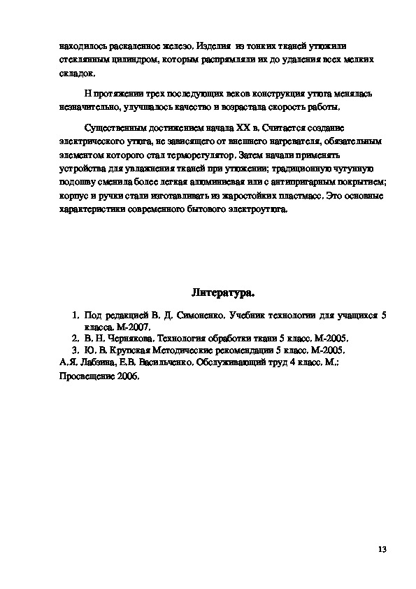 2. В. Н. Чернякова. Технология обработки ткани 5 класс. М2005.
