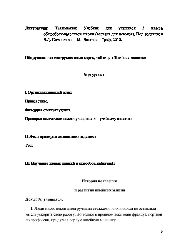 Оборудование: инструкционные карты, таблица «Швейная машина»