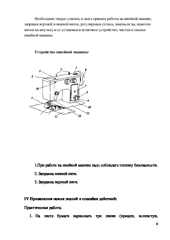 ножного привода; научить выполнять прямолинейные строчки на машине без