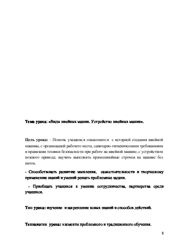Цель урока: - Помочь учащимся ознакомится с историей создания швейной машины, с организацией рабочего места, санитарно-гигиеническими требования-ми и правилами техники безопасности при работе на швейной машине, с уст¬ройством ножного привода; научить выполнять пря¬молинейные строчки на ма-шине без ниток.