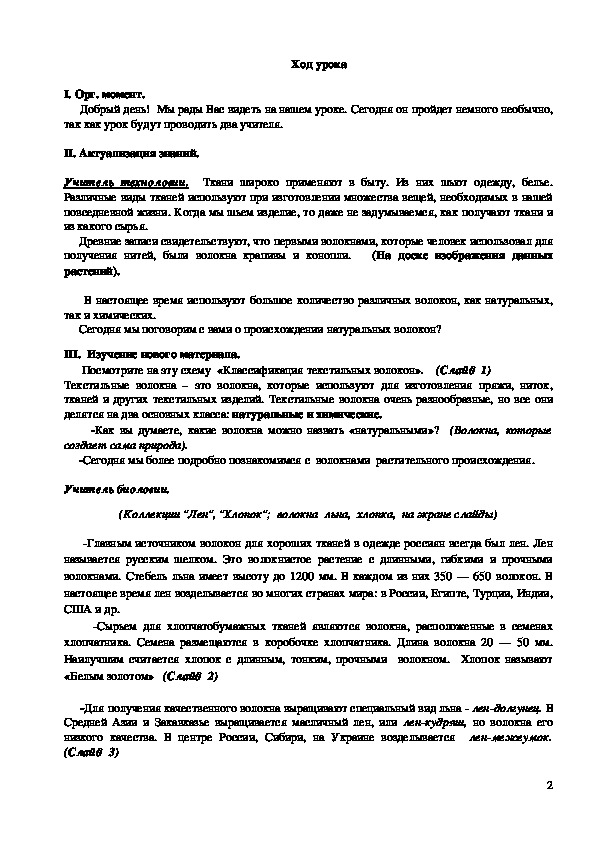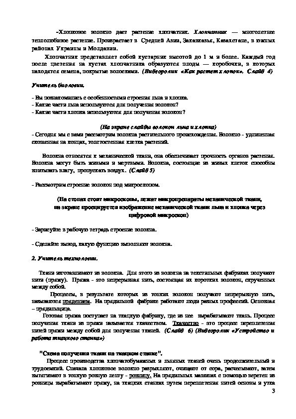 (Коллекции "Лен", "Хлопок"; волокна льна, хлопка, на экране слайды)