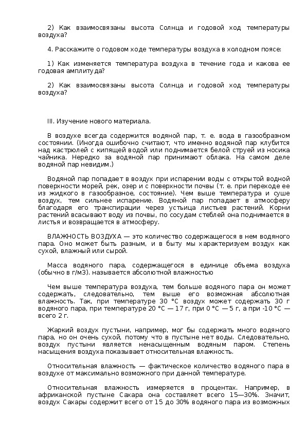 Цели: Сформировать понятия «ненасыщенный» и «насыщенный» воздух, «абсолютная и относительная влажность воздуха», «атмосферные осадки».