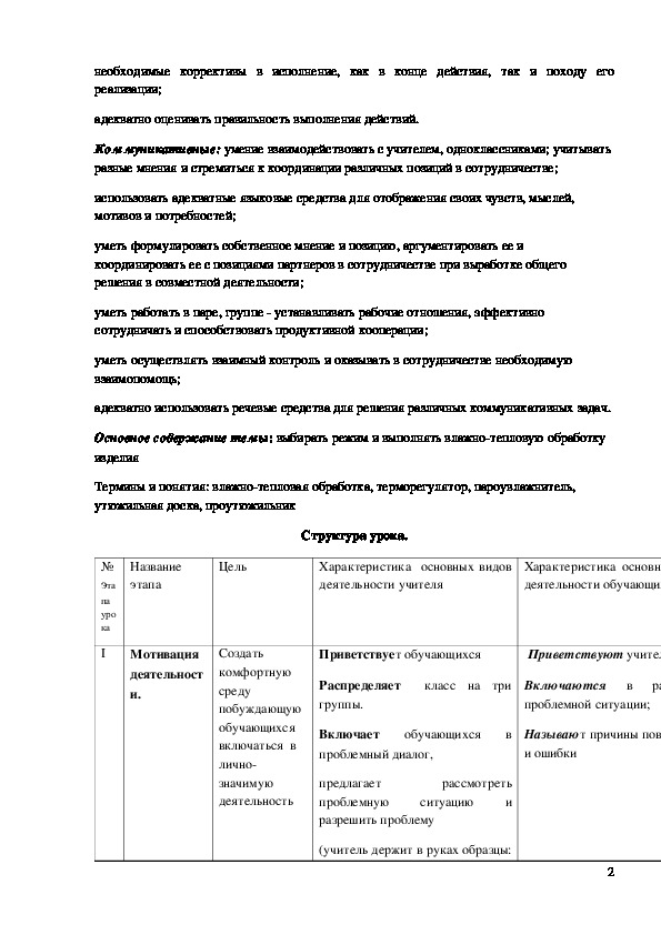 Цель: содействовать овладению обучающимися умениями и навыками выполнения влажно-тепловой обработки ткани с учетом их особенностей на основе ценностного отношения к эстетической культуре и достижение следующих результатов:Личностные: проявление познавательных интересов и активности в данной области предметной технологической деятельности;