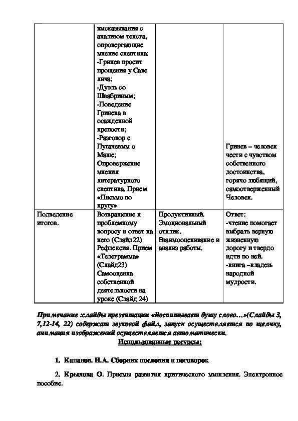 -Проанализировать ряд эпизодов повести А.С.Пушкина «Капитанская дочка» и ответить на вопрос, сформулированный в теме урока;Конспект урока "Воспитывает душу слово…" 11 класс