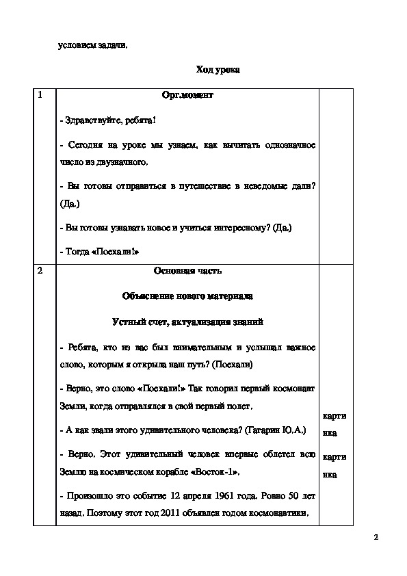 устного счета и рефлексии, карточка в виде ракеты с написанным на ней