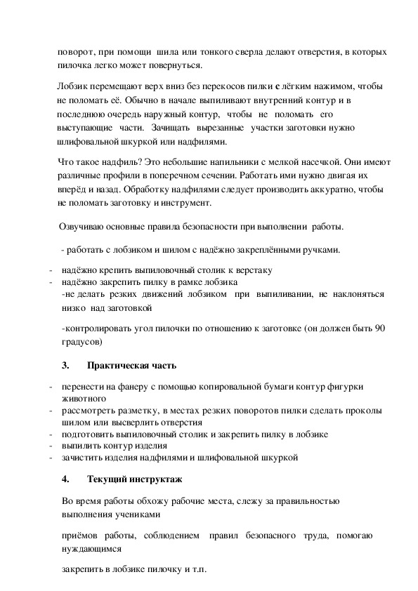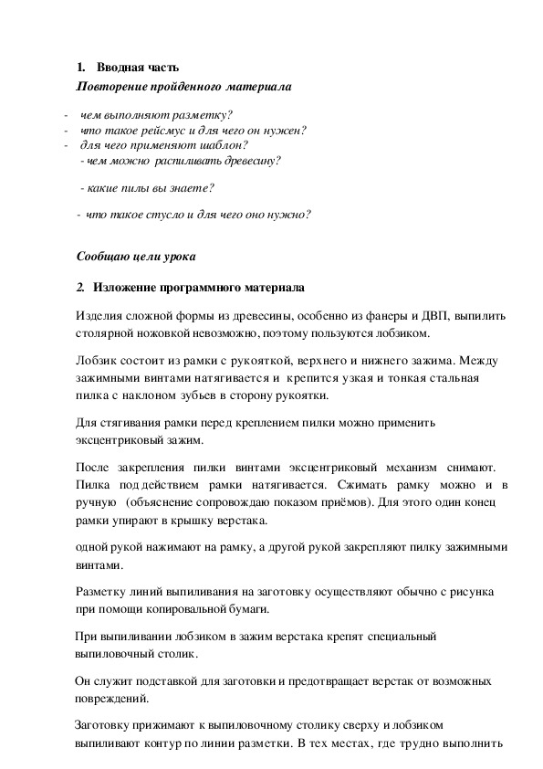 Цель: расширить знания учащихся об обработке изделий разнообразной формы из фанеры и ДВП лобзиком, ознакомить со способами наладки и регулировки лобзика, с приёмами пиления данным инструментом, с правилами безопасности труда, воспитывать бережливость в расходовании материалов, аккуратность и точность в работе.