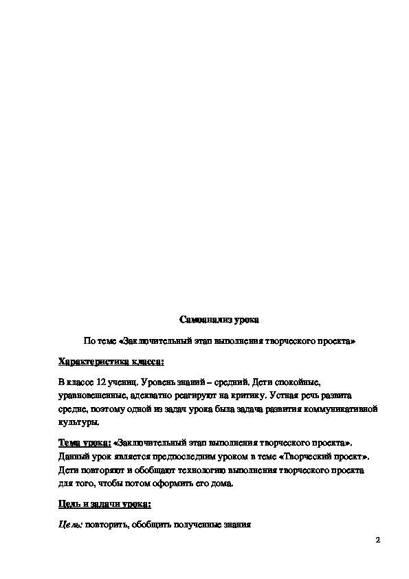 Конспект урока "Заключительный этап выполнения творческого проекта" 6 класс.Урок в 6 «В» классе