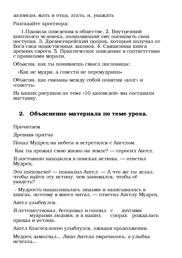 Цель: формирование представления о нравственных критериях, заключенных в заповедях.