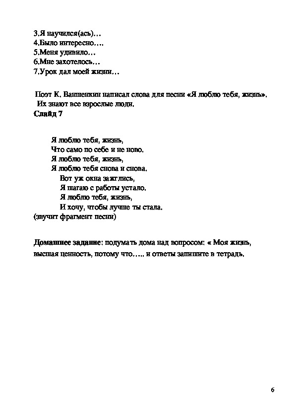 Домашнее задание: подумать дома над вопросом: « Моя жизнь,