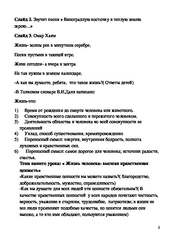 Тема урока: « Жизнь человека высшая нравственная ценность»