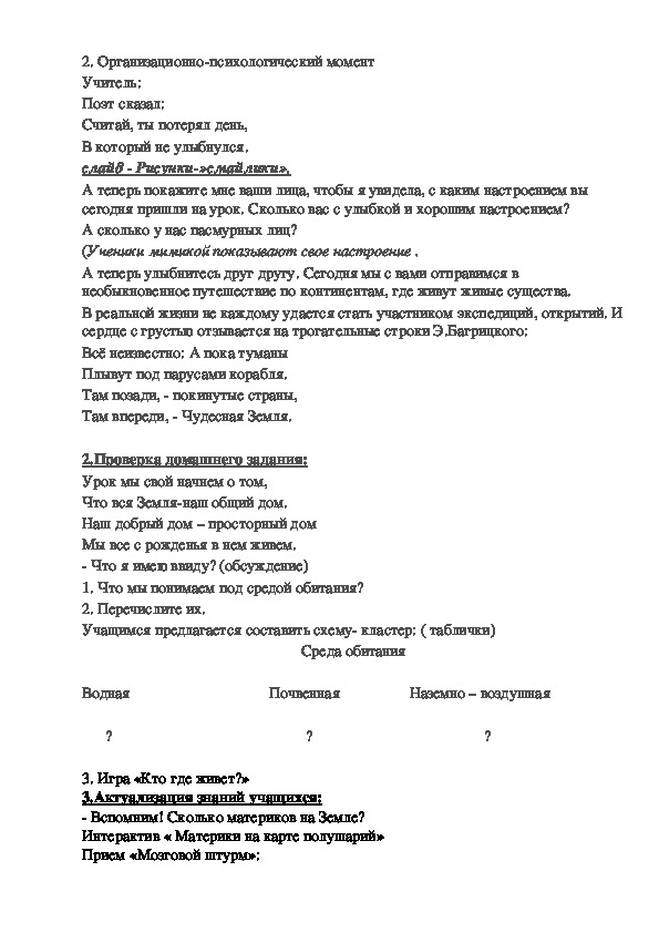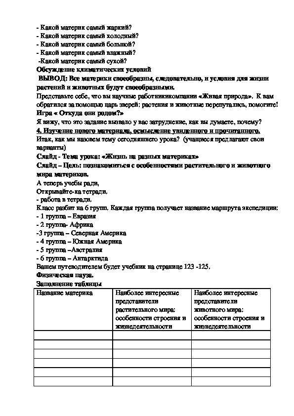 - помочь учащимся в осознании и осмыслении материала о растительном и животном мире разных материков Земли;
