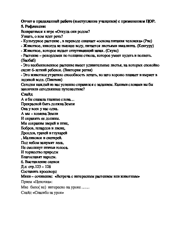 Цель: осознание и осмысление материала о растительном и животном мире земли; развивать интеллект школьников.
