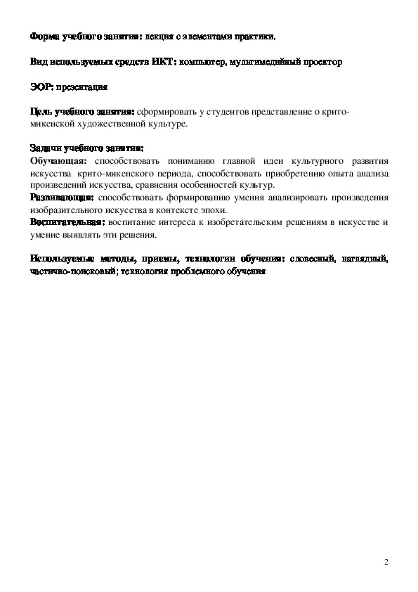 искусства критомикенского периода, способствовать приобретению опыта анализа