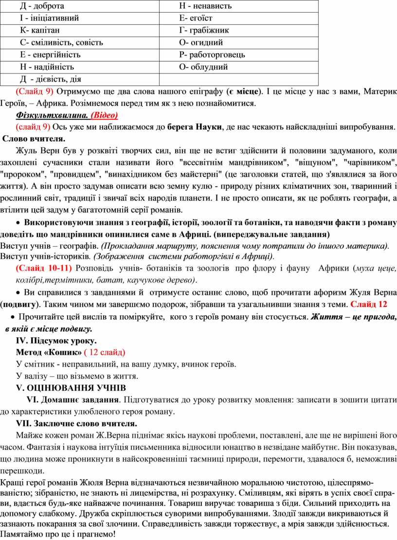 Обладнання: текст роману Ж.Верна «П'ятнадцятирічний капітан», виставка ілюстрацій до роману, карта світу, «Кошик поганих вчинків», «Валіза в життя», «Схема маршруту подорожі», комп’ютерна презентація.