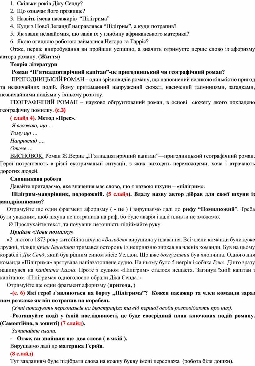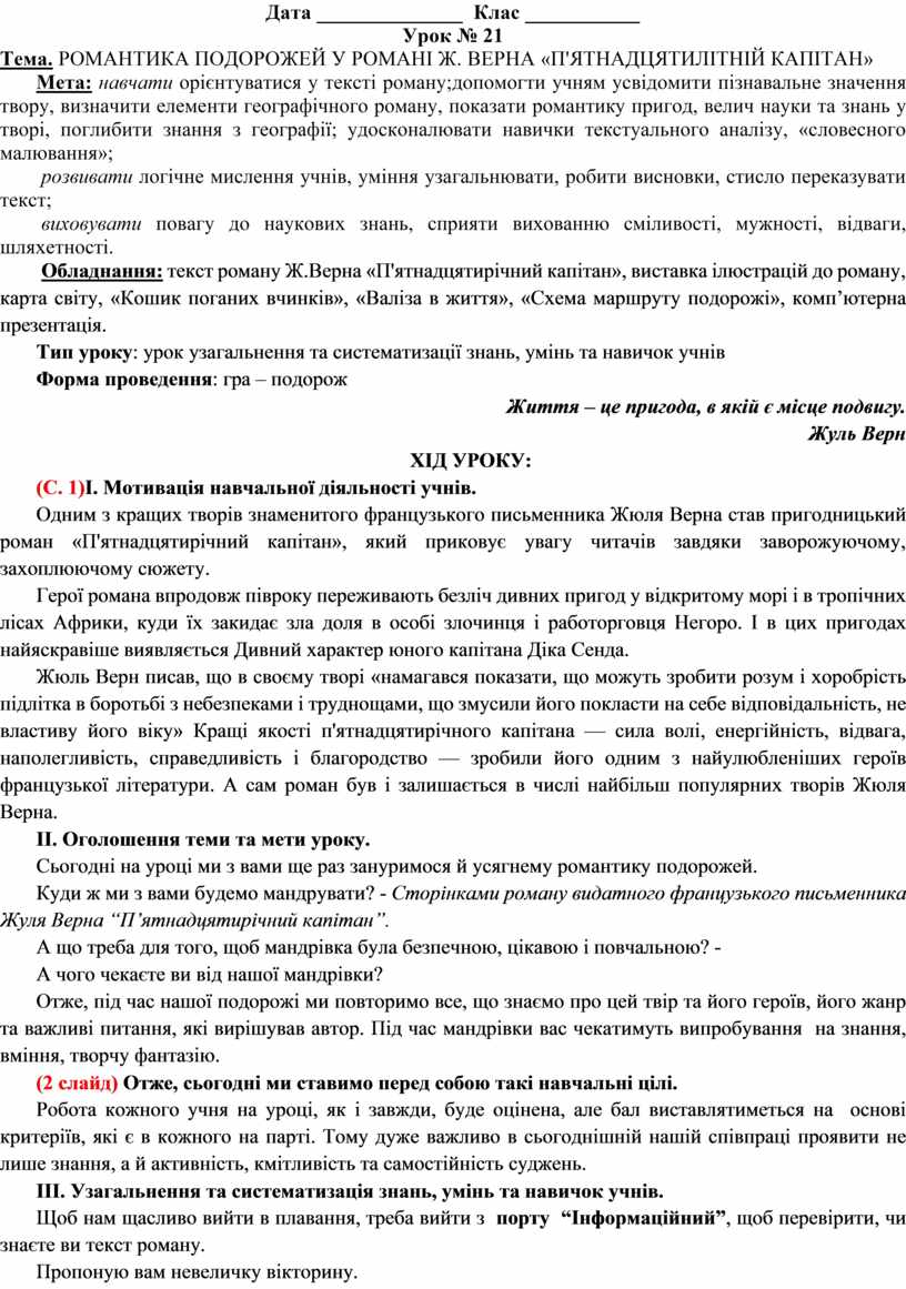 Тема. РОМАНТИКА ПОДОРОЖЕЙ У РОМАНІ Ж. ВЕРНА «П'ЯТНАДЦЯТИЛІТНІЙ КАПІТАН»