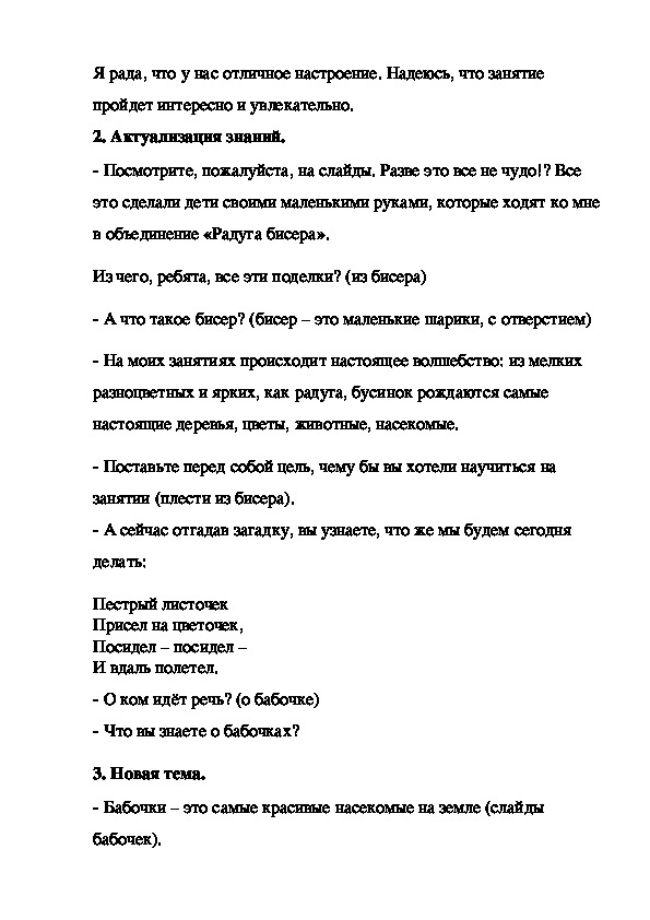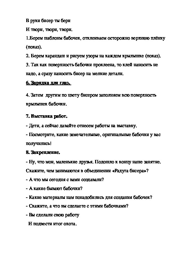 Конспект занятия по бисероплетению: "Введение в образовательную программу (изготовление бабочки из бисера)".