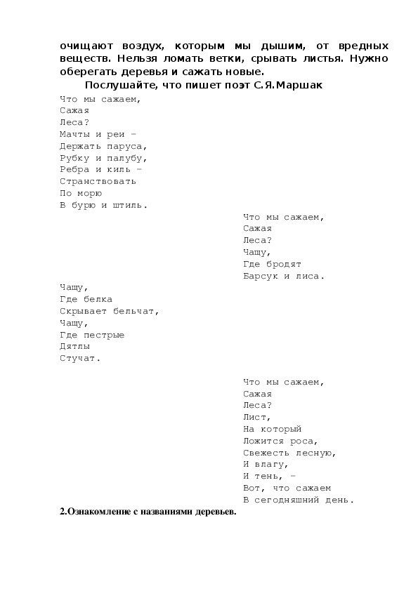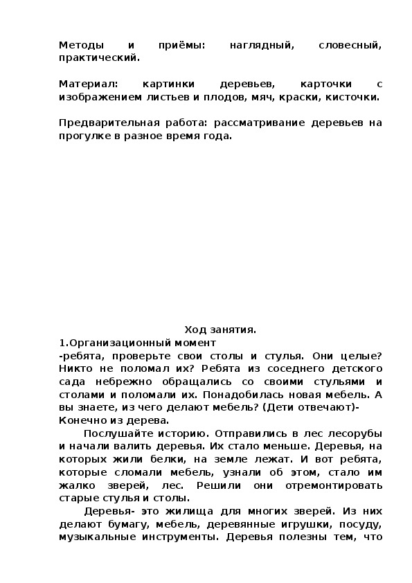 Цели: познакомить с названиями некоторых деревьев, составными частями дерева, пользой деревьев, учить бережно относиться к растениям, учить правильно рисовать красками.