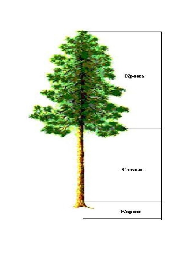 Воспитатель показывает на картинке корни, ствол, ветки, крону,